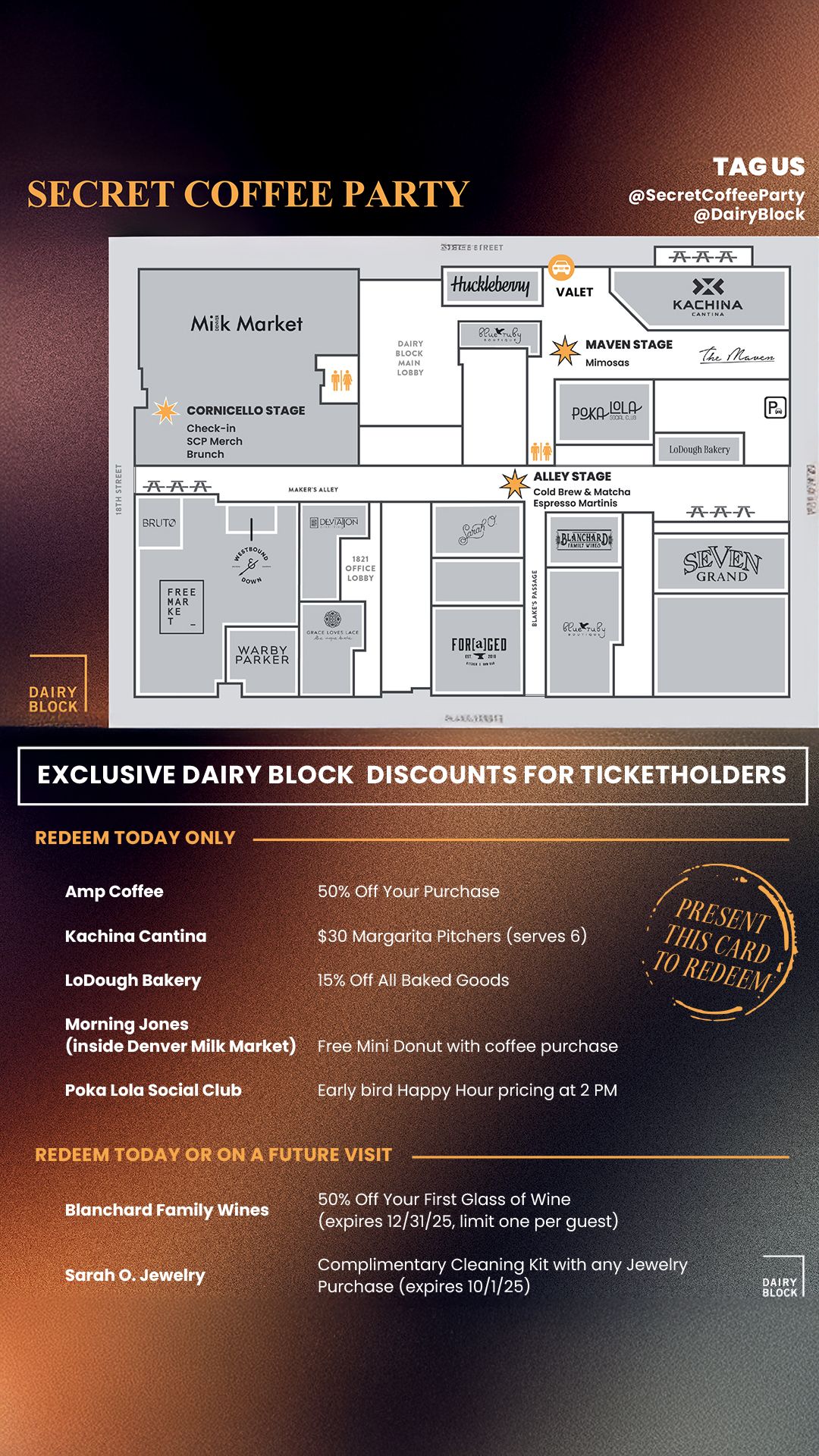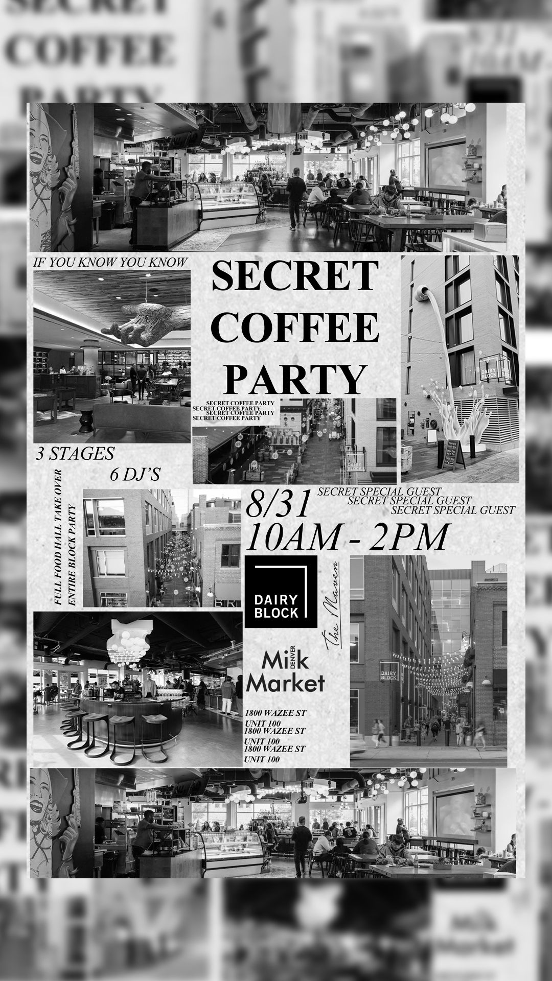 Tomorrow, Sunday Aug 31 β’ 10AMβ2PM, Secret Coffee Party returns to Denver Milk Market & Dairy Block βοΈβ¨ A full food hall + block takeover with 3 stages β’ 6 DJs β’ surprise sets.